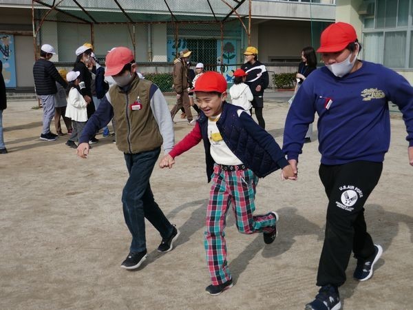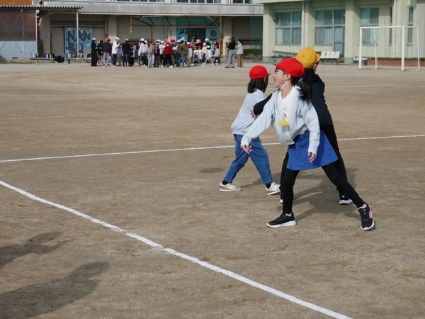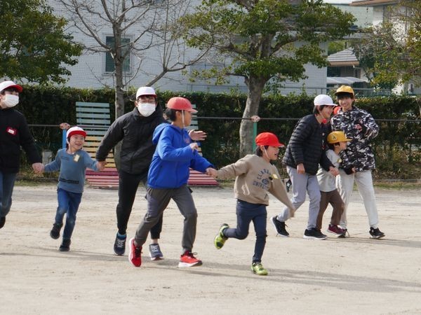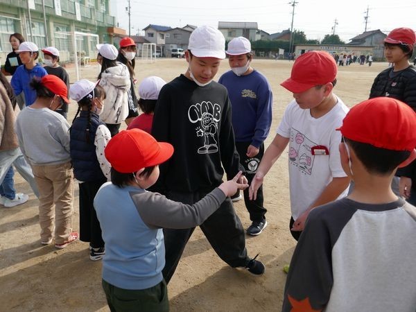 1年2組と6年1組のペアは、最初に王様じゃんけん。次いでペアで「どろけい」です。6年生と手をつないで走る1年生も、4月に比べて速くなりました。