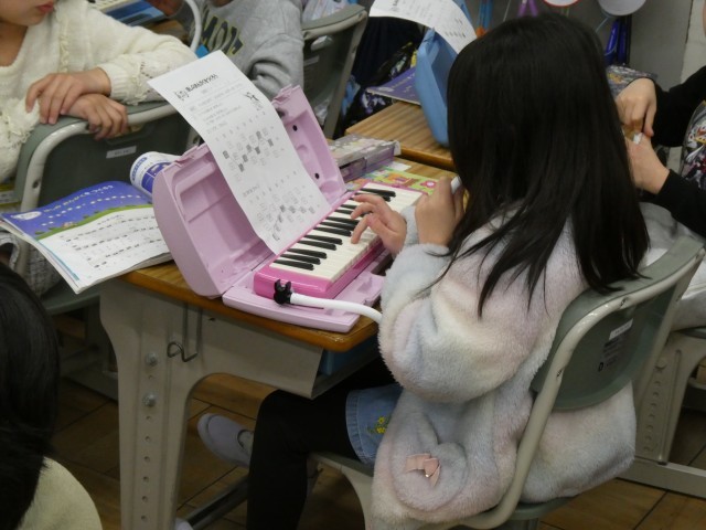 鍵盤ハーモニカを使って、一音一音を引きながら、「つづくかんじ」と「おわるかんじ」を、自分で作った旋律を音にしていきました。