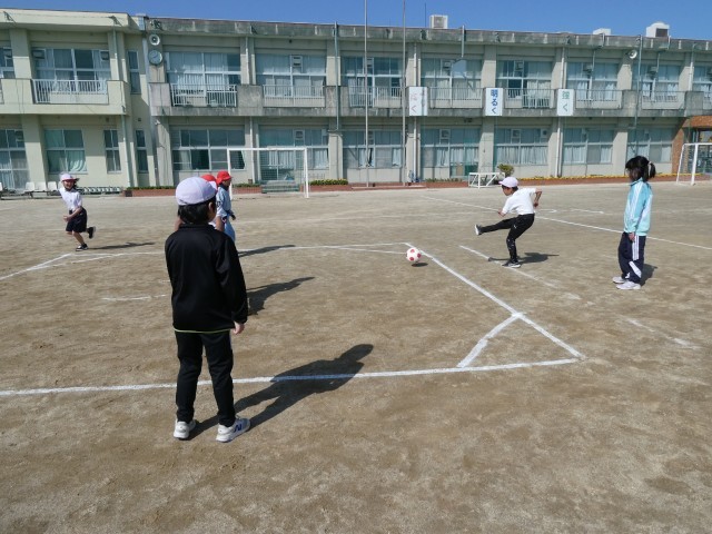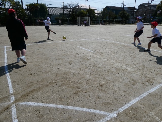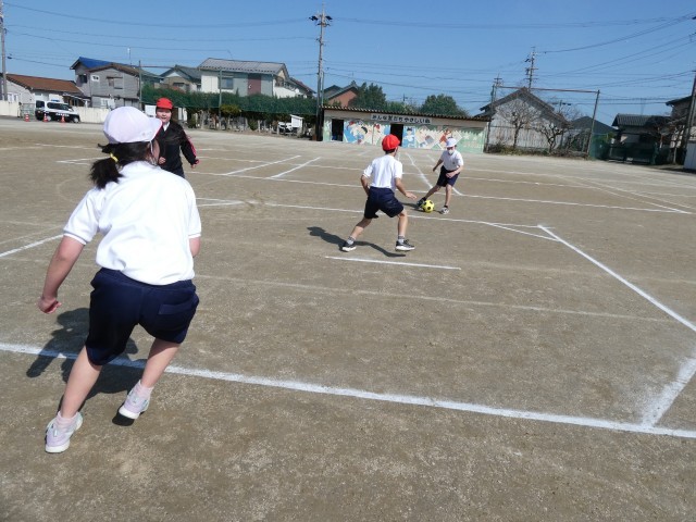今、4年生の体育では「スクエアサッカー」というボール運動に取り組んでいました。