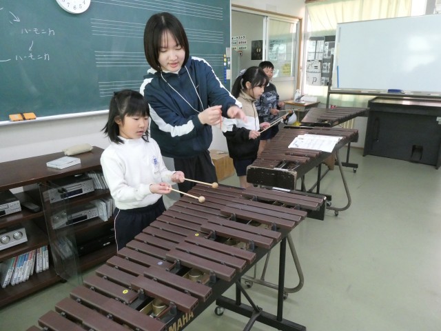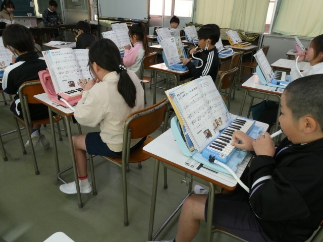 隣の席の友達と音を合わせ、きれいな「こぎつね」の旋律が教室いっぱいに広がりました。