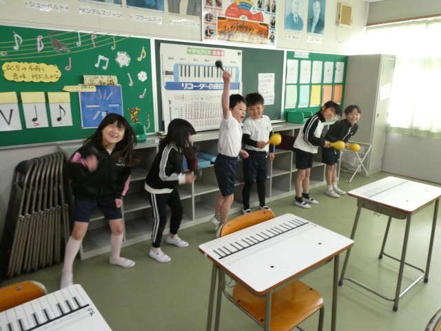 2年生の音楽は、教室中に元気なリズムと歌声が響きわたる、とても賑やかな時間となりました。