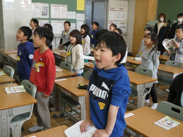 1年間ペアでお世話になった6年生に感謝の気持ちを伝えようと歌の練習をしていました。