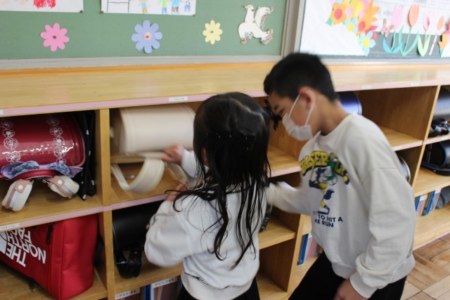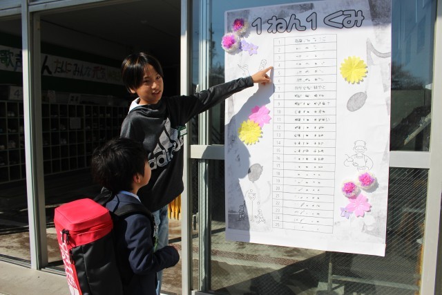 貼りだされた自分のクラスを一緒に確認したり、教室でランドセルをロッカーにしまうのを手伝ったりと、最高学年らしい頼もしい姿が見られました。
