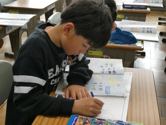 「長崎県にはカステラがあるんだ」「リンゴは青森県だね」と、特産品のマークを見つけながら、地図帳の楽しさを味わっていました。