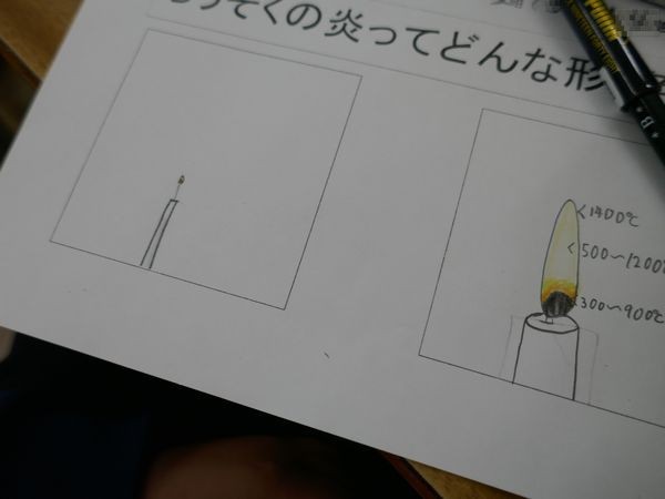 ろうそくでは、自分のろうそくのイメージを左側に書き、実際の様子を右側に書きました。ずいぶんイメージと違います。