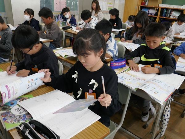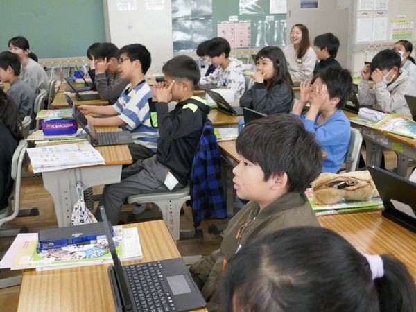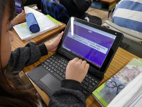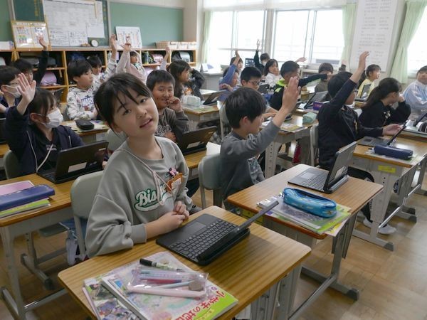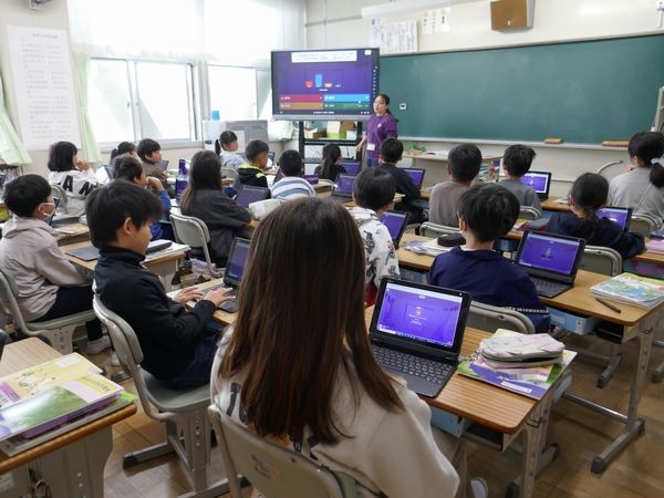 4年2組の社会科は都道府県の勉強でした。今日は、北海道、東北地方。最初にタブレットを使ってクイズに挑戦です。その県の有名なものをヒントに答えた後は、旅行した経験や知っていたことを発表し合い、関連付けていきます。