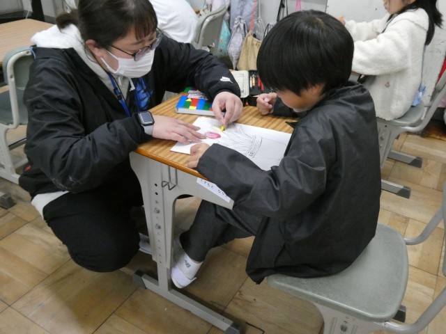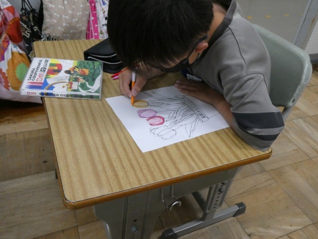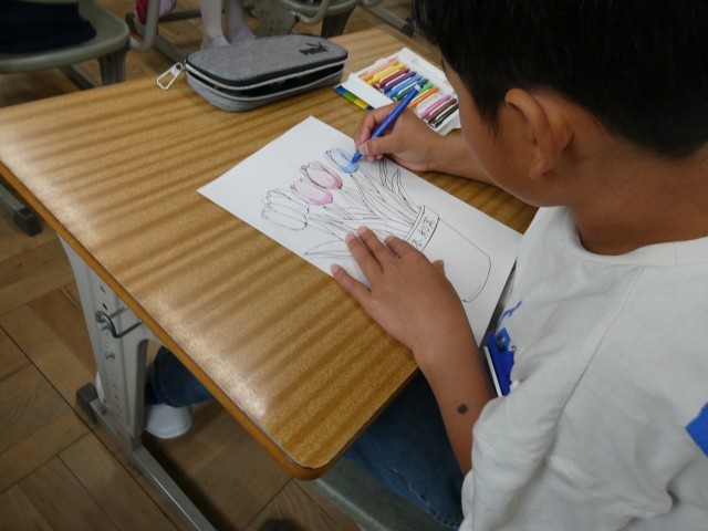 3年生が取り組んでいたのは、色えんぴつやクーピーを使った「色のぬり分け」です。
