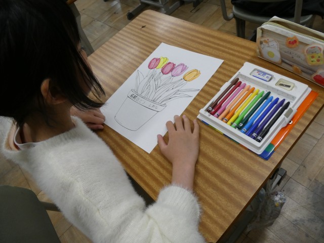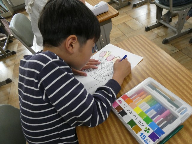 「花びらが重なっているところは濃くしてみよう」と、自分で考えながら色を重ねていました。