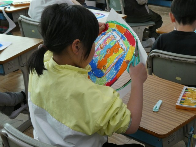 たまごが描けたら、次はいよいよハサミで切り抜く作業です。