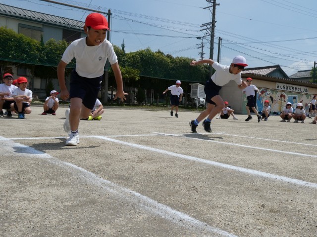 4年生の体育では新体力テストに向けた「50m走」の練習を行いました。