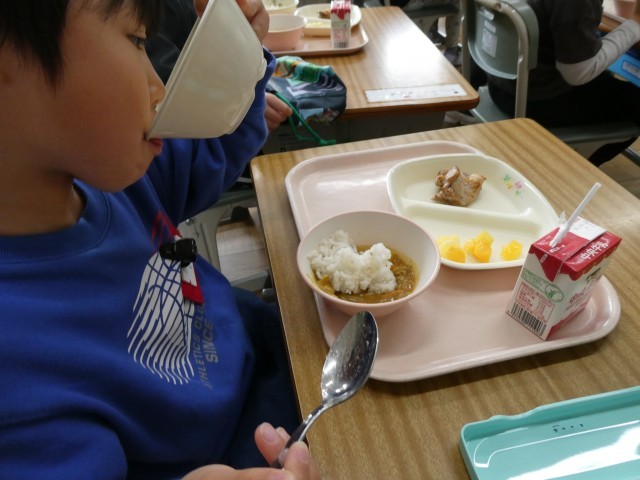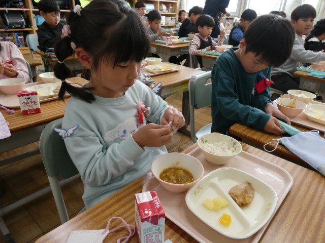 大きな口を開けてカレーを頬張る子、牛乳を上手に開けて飲む子、ハーブ焼きの香りを楽しみながら食べる子など、教室中が幸せな笑顔でいっぱいになりました。