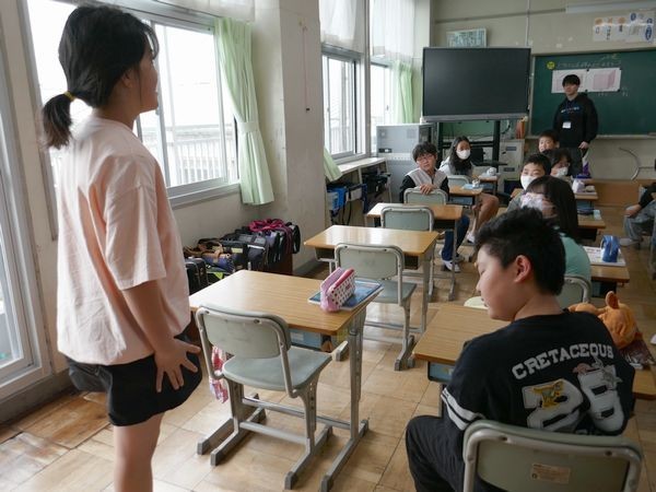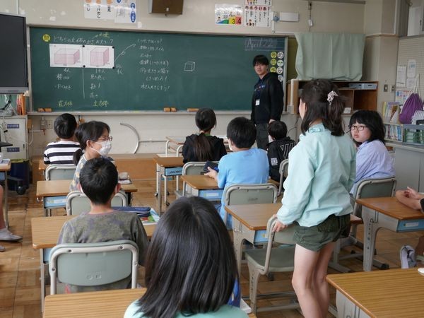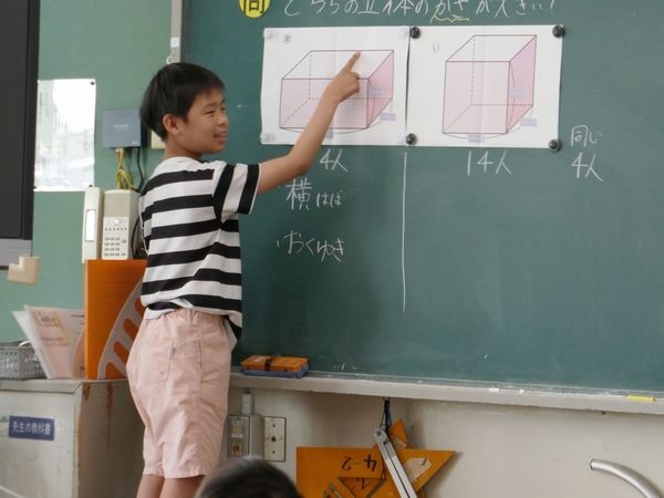 5年2組の子ども達は算数の勉強をしていました。今日は、黒板に貼られた2つの立体が学習問題。どちらが大きいか、どうやったらわかるのか、考えて意見を交換しました。