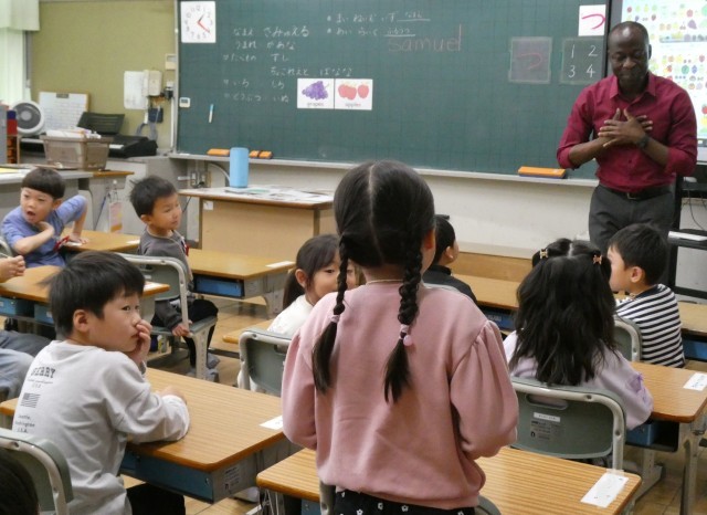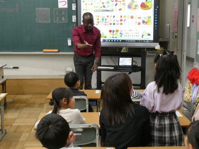 先生の好きな食べ物や色のクイズに、子どもたちは興味津々でした。聞き取りやすいゆっくりとした英語でみんなに出身地のガーナや好きな食べ物について話してもらいました。