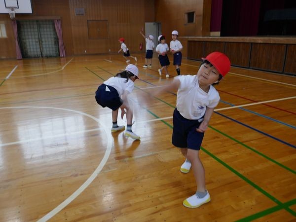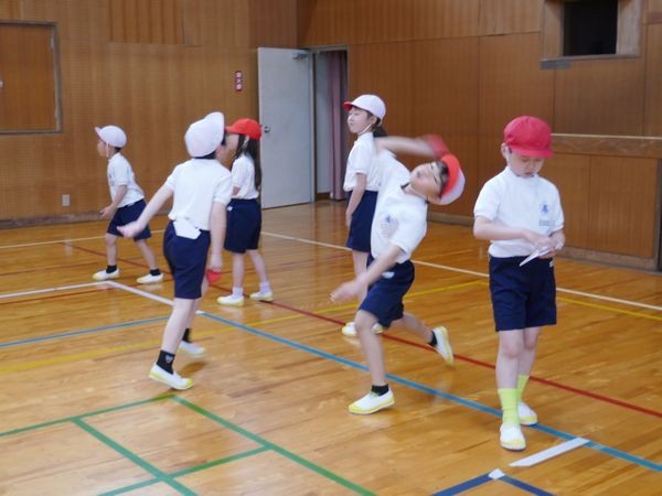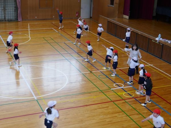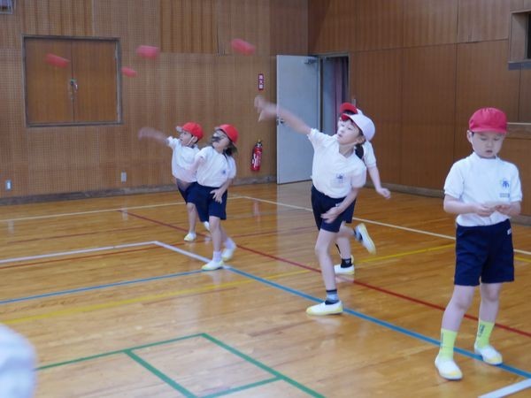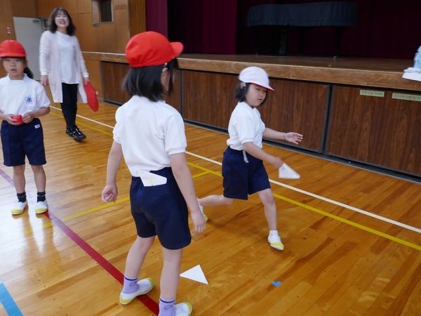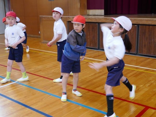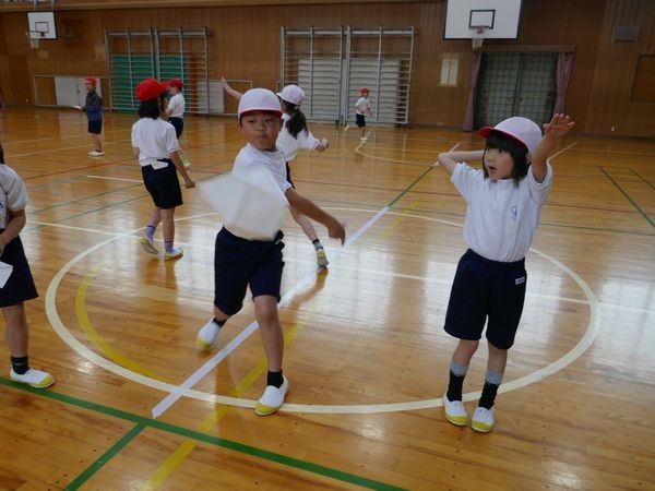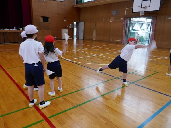 今日は雨。2年1組の子ども達は体育館で体育の授業です。来月行われるのが、愛知県の数値が低い体力テスト。このテストの一つであるソフトボール投げの記録向上を目指し、子ども達が工夫して取り組んでいたのは紙鉄砲とお手玉でした。手首を使って紙鉄砲を鳴らし、手を伸ばしてお手玉を投げる方向を確かめつつ、体が横向きになっていることを確認します。がんばって練習していると、紙鉄砲がくしゃくしゃになったり、お手玉が上に載ってしまったり…。