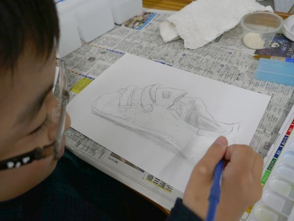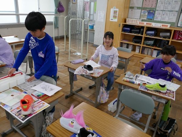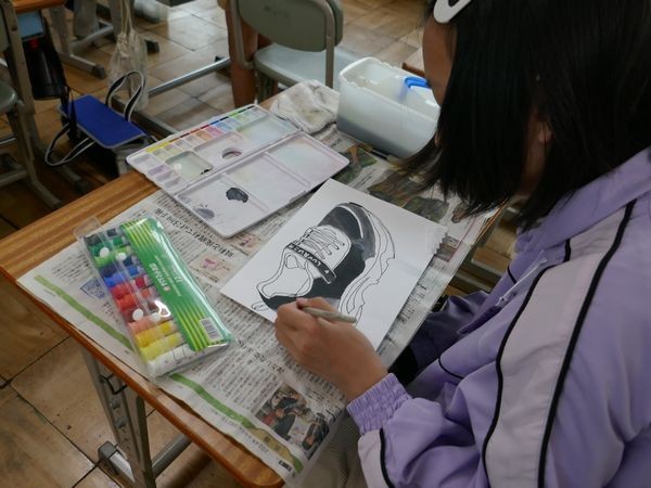 5年1組は図工。子ども達は靴の絵を描いていました。形を捉え、材質の特徴を生かして、絵の具で色を付けたり、陰影を付けたりしていきます。今日は雨。「長靴で来ちゃったから…。」 靴を見ることのできない子もいました。