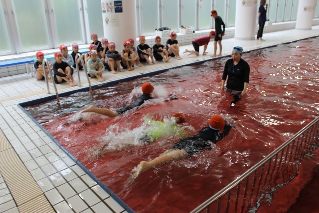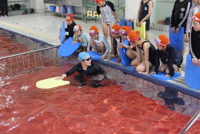 「高学年なら、公共の場所ではどのように行動するとよいかな?」と先生が投げかけると、子ども達は通路の端を真っすぐに歩き、すばやく更衣を済ませ、静かにプールサイドに並んで待つことができていました。準備体操をし、入水しました。水慣れの活動では、みんなで単語を唱和しながら、「ん」の言葉がついたときに、頭の先までプールに潜りました。「みかん」「めろん」「あんぱん」と、「ん」の言葉が増えていくと、子ども達は「わー」「大変!」と口にしていながらも楽しそうに水に親しんでいました。続いて、コース別に分かれて授業を進めていきました。水の中をゆっくりと歩くことのできる「ペンギンコース」では、けのびに取り組みました。水に顔をつけるのが苦手な子もいましたが、先生の実演を見ながらイメージをつかみ、フォームを整えていきました。まだ、体に力が入ってしまいますが、しっかり壁を蹴って、前に進むことができました。水の中をスイスイ進むことができる「イルカコース」では、バタ足の仕方を意識しながらクロールの練習をしました。プールサイドに座ってバタ足をしたり、プールのへりをつかみ、水に体を浮かせてバタ足をしたりしながら、水を蹴る感覚を養いました。最後には、ビート板ありで泳ぐ、ビート板ありで手の回転をつけて泳ぐ、ビート板なしで泳ぐの中から、自分で難易度を設定して、たくさんクロールの練習をしました。