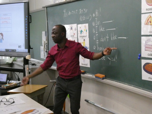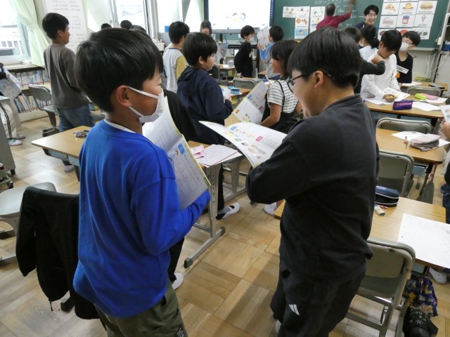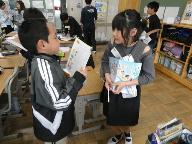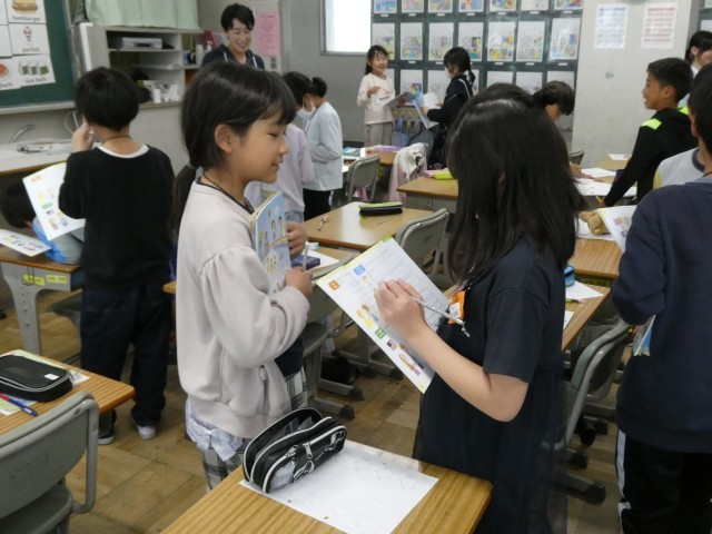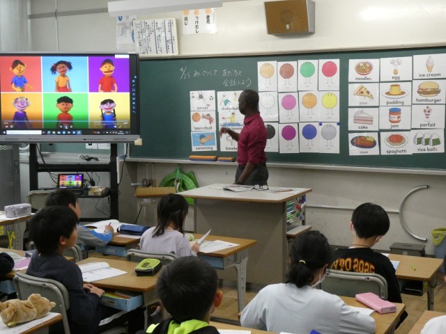 4年生の外国語活動では、ALTの先生と一緒に、英語を使ってコミュニケーションを図っていました。