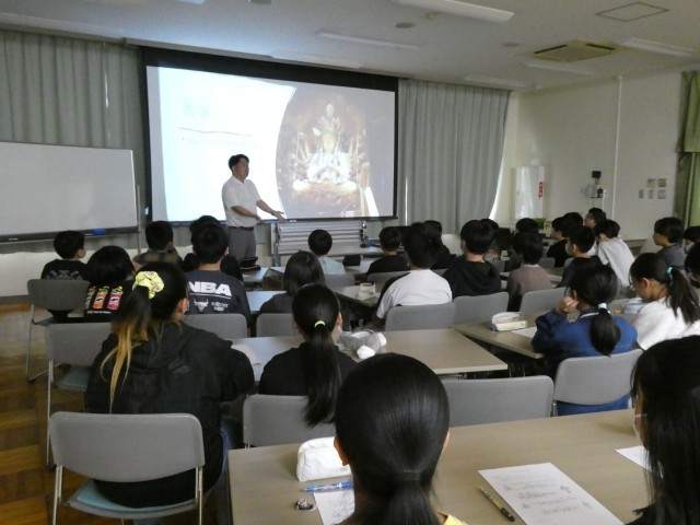 6月の修学旅行に向けて、本校の神谷先生を講師に迎え、奈良や京都で出会う「仏像」をより深く知るための特別授業が行われました。