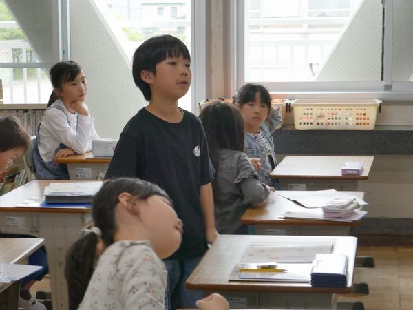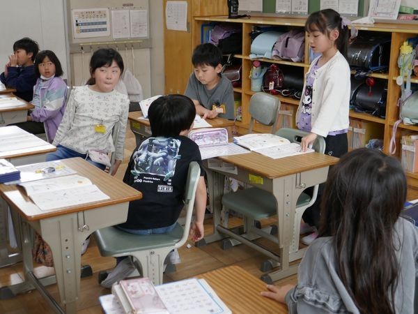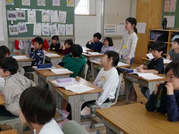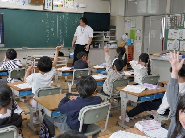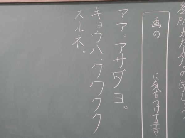 2年2組の書写。黒板を見ると「?」。読みづらい字が並んでいます。「アア」と思ったら、なんと「ママ」だそう!子ども達はどこがいけないのか、次々と発表していきました。