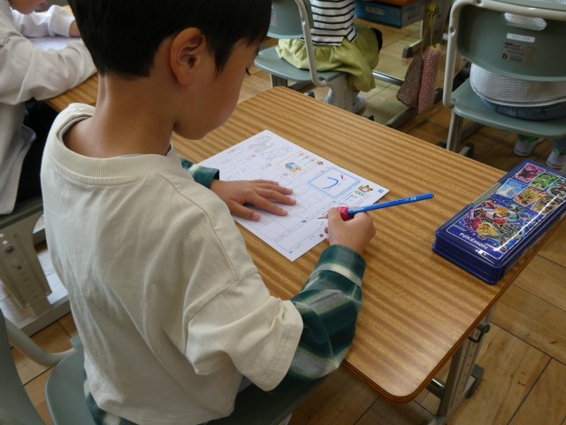 「う」の一画目は、「1の部屋から始まり、2の部屋で止める。二画目は、1の部屋から始まり、2と4の部屋を通って、3の部屋で払う」という細かい動きを確認して、プリントに一画ずつ丁寧に清書しました。姿勢を正して、一画一画に集中する姿は、とても立派でした。