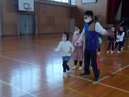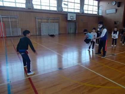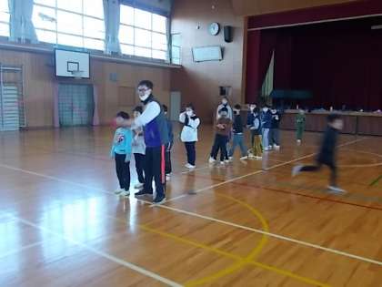 長縄で八の字跳びの練習をしました。担任の先生にタイミングをとってもらいながら、跳んでいました。コツをつかむと、連続で跳べるようになるので、がんばってください。