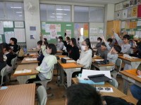 校外学習で「竹とんぼづくり」「風車作り」などの体験学習を行います。体験学習で何を行うかを決めました。先生の説明を真剣に聞いていました。