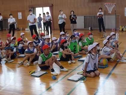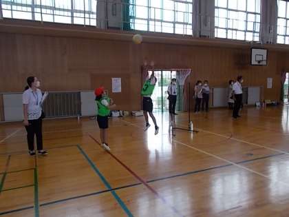 「セストボール」を行いました。大勢の先生方に見ていただいている中、友達と協力しながら、どのようにパスを出すとうまくいくかを考えながら、プレーしました。