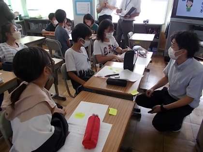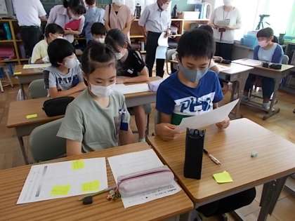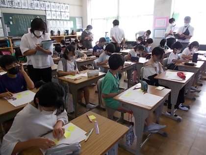 「たずねびと」を学習しました。主人公の気持ちをペアで話し合いました。たくさんの先生方が見ていましたが、活発な話し合いをしていました。