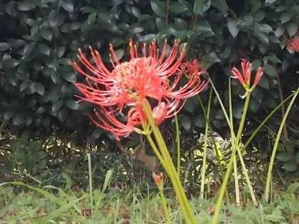 体育館の西側に彼岸花が、とてもきれいに咲いています。もう、秋ですね。