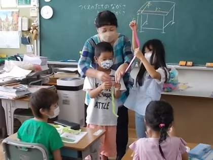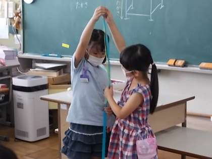 紙テープを使って、机の長さや壁の長さなど、それぞれが測りたい場所の長さを測りました。その後、どちらが長いかを紙テープの長さを比べて調べました。