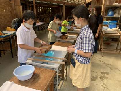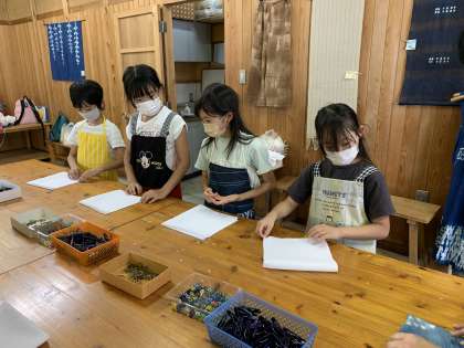 次に体験学習を行いました。藍染と紙すき体験の様子です。