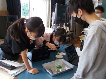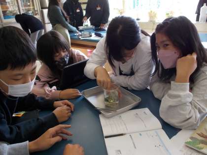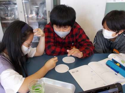 「葉」を使って、「光が当たっている植物は何の気体を取り入れて、何の気体を出しているのだろうか」を確かめました。