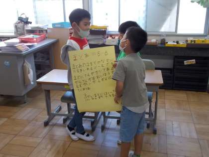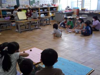 幼保小一斉交流会に向けて、「どんぐりごまづくり」や「的当て」などを行う際のルール説明の練習を行いました。グループで練習した後、全体で発表しました。みんな堂々としていて、立派でした。本番が楽しみです。