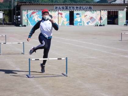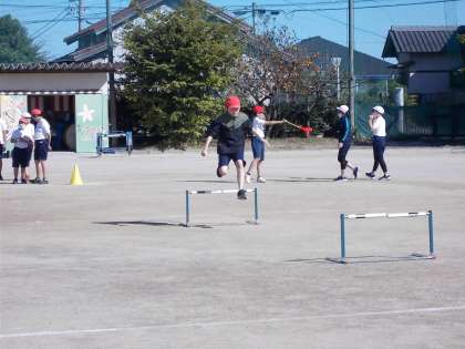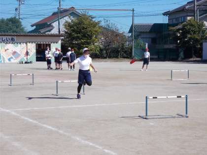 ハードルを行っていました。タイムを計っていました。みんな、全力で走っていました。