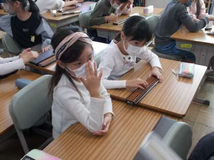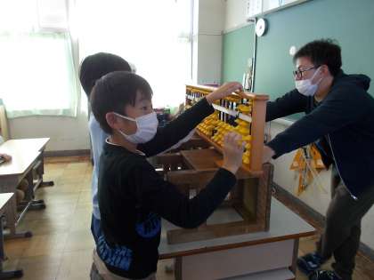 「そろばん」の学習をしました。友達と計算の仕方を確認したり、大きなそろばんで実際に計算したりしました。