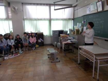 手話体験の様子です。会話以外で伝える方法に「口話」「指文字」「身ぶり」「手話」「空書」「筆談」があることなどを学んだり、実際に「口話」や「身ぶり」で伝えることを体験したりしました。児童たちは、講師の方の質問に積極的に答えていました。