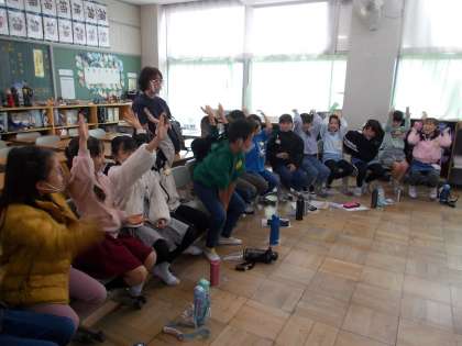 手話体験の様子です。児童がうさぎや犬などを身ぶりで表し、友達が当てました。その後、手話ではどう表すかを講師の方に教えていただきました。