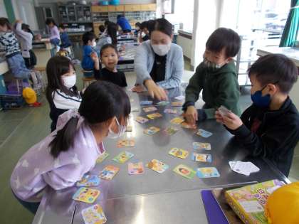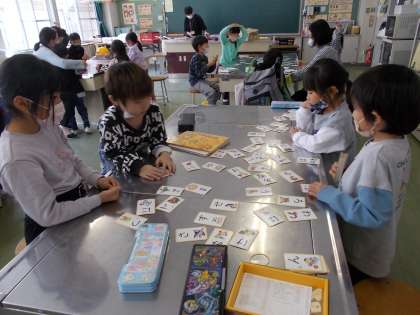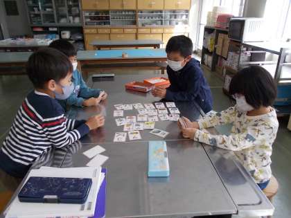 「昔話カルタ」を行いました。グループの一人が札を読み、その他の児童がとっていました。けんかをすることなく、仲良く取り組むことができました。