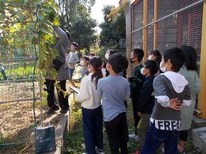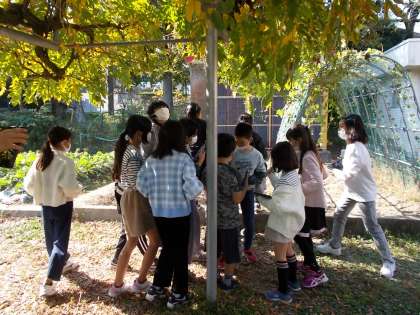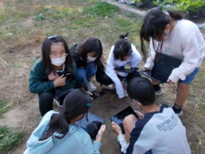 秋の植物や生き物を見つけ、タブレットで写真を撮りました。ヘチマ、藤の花の実、蟻などを観察していました。