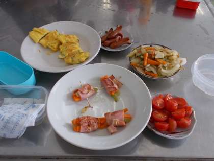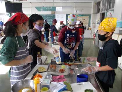 「たこさんウインナー」「卵焼き」「ジャーマンポテト」など、おいしそうなおかずが出来上がりました。とてもよいにおいがしていました。