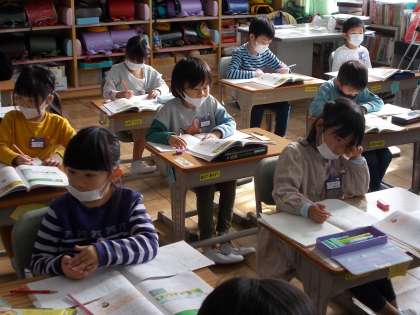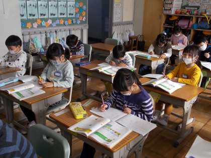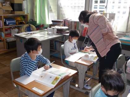 「10と□にわけてけいさんしよう」をめあてに学習しました。さくらんぼ型で数字をわけて計算しました。どの児童も真剣でした。問題が解けたら、先生に○を付けてもらいました。