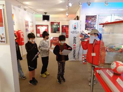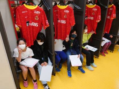 観客席での説明後に、ギャラリーやロッカールームなどを見学しました。選手ロッカールームの隣には、監督・コーチルームがあり、そこでミーティングをしているそうです。選手ロッカールームでは、レプリカユニフォームが飾られているロッカーに座らさせてもらいました。