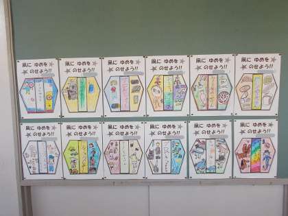 廊下の掲示版に凧のデザイン画が貼ってあります。将来の夢とそれに関する絵が描かれています。どれも素敵です。