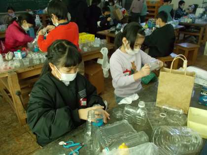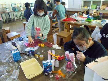 「クリスタルアニマル」を学習しました。卵のパックなどの透明のプラスチックなどを使って動物を作りました。ジンベエザメやうさぎなど、個性的な作品が出来上がっていました。どの児童も楽しそうに作っていました。