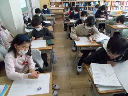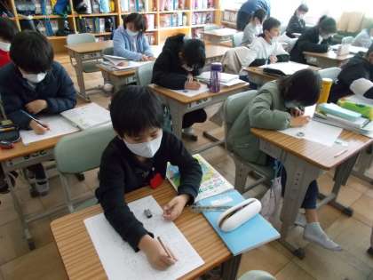 白地図のプリントに都道府県を書きました。真剣に漢字で書いていました。全部覚えられるとよいですね。