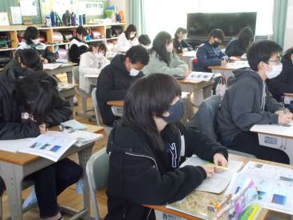 「領土・領海・領空・排他的経済水域」について、先生が説明していました。児童たちは、真剣に聞いていました。