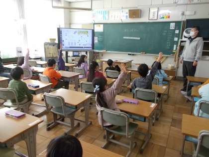 「おなじかずずつ」を学習しました。先生が、おはじきを同じ数ずつ何人に分けられるかを質問しました。たくさんの児童が手を挙げました。代表の児童が前に出て、てきぱきと解いていました。