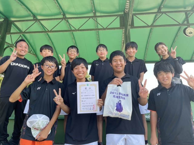 9/7(日) 半田市スポーツ大会(半田祭)男子ソフトテニス部 公開日 2025/09/07 更新日 2025/09/07 部活動 +6 男子ソフトテニス部が半田市スポーツ大会に参加しました。1回戦と2回戦を勝ってベスト4となり、準決勝戦に進みました。準決勝戦では、惜しくも負けてしまいましたが、3位というすばらしい結果を残しました。。その後行われた県大会出場決定戦を2-1で勝利し、見事、県大会出場を決めました。どの試合も接戦でしたが、声を掛け合いながら粘り強く戦う姿はすてきでした。県大会でも活躍してくれると思います。期待していますよ。