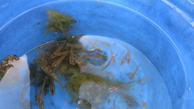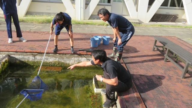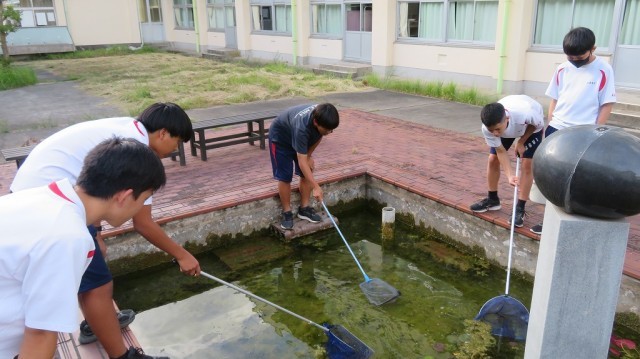 3年生生徒の有志で、北館校舎と本館校舎の間にあるメダカ池の清掃活動に取り組んでいます。1日目の今日は「メダカの引っ越し」をしました。互いに声を掛け合いながら、メダカをつかまえてバケツに移し替えました。やっていくうちにこつをつかみ、スムーズにつかまえられるようになりました。