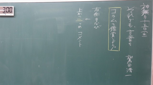 3年生は、コラムについて鑑賞を行っています。前の時間に自分の選んだコラムについて感じたことや気付いたことなどをまとめました。今日は、友達のまとめを互いに見合い、そのよさを伝え合いました。集中して友達の作品について感想を伝えようとする姿はさすが3年生でした。これからも仲間のよさを見つけ、高め合っていきましょう。